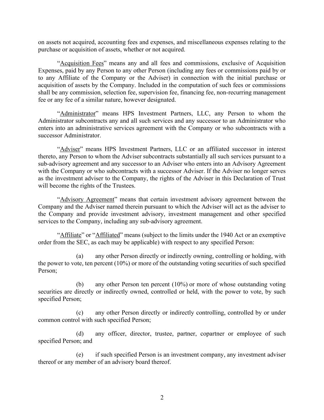 2 on assets not acquired, accounting fees and expenses, and miscellaneous expenses relating to the purchase or acquisition of assets, whether or not acquired. “Acquisition Fees” means any and all fees and commissions, exclusive of Acquisition Expenses, paid by any Person to any other Person (including any fees or commissions paid by or to any Affiliate of the Company or the Adviser) in connection with the initial purchase or acquisition of assets by the Company. Included in the computation of such fees or commissions shall be any commission, selection fee, supervision fee, financing fee, non-recurring management fee or any fee of a similar nature, however designated. “Administrator” means HPS Investment Partners, LLC, any Person to whom the Administrator subcontracts any and all such services and any successor to an Administrator who enters into an administrative services agreement with the Company or who subcontracts with a successor Administrator. “Adviser” means HPS Investment Partners, LLC or an affiliated successor in interest thereto, any Person to whom the Adviser subcontracts substantially all such services pursuant to a sub-advisory agreement and any successor to an Adviser who enters into an Advisory Agreement with the Company or who subcontracts with a successor Adviser. If the Adviser no longer serves as the investment adviser to the Company, the rights of the Adviser in this Declaration of Trust will become the rights of the Trustees. “Advisory Agreement” means that certain investment advisory agreement between the Company and the Adviser named therein pursuant to which the Adviser will act as the adviser to the Company and provide investment advisory, investment management and other specified services to the Company, including any sub-advisory agreement. “Affiliate” or “Affiliated” means (subject to the limits under the 1940 Act or an exemptive order from the SEC, as each may be applicable) with respect to any specified Person: (a) any other Person directly or indirectly owning, controlling or holding, with the power to vote, ten percent (10%) or more of the outstanding voting securities of such specified Person; (b) any other Person ten percent (10%) or more of whose outstanding voting securities are directly or indirectly owned, controlled or held, with the power to vote, by such specified Person; (c) any other Person directly or indirectly controlling, controlled by or under common control with such specified Person; (d) any officer, director, trustee, partner, copartner or employee of such specified Person; and (e) if such specified Person is an investment company, any investment adviser thereof or any member of an advisory board thereof.