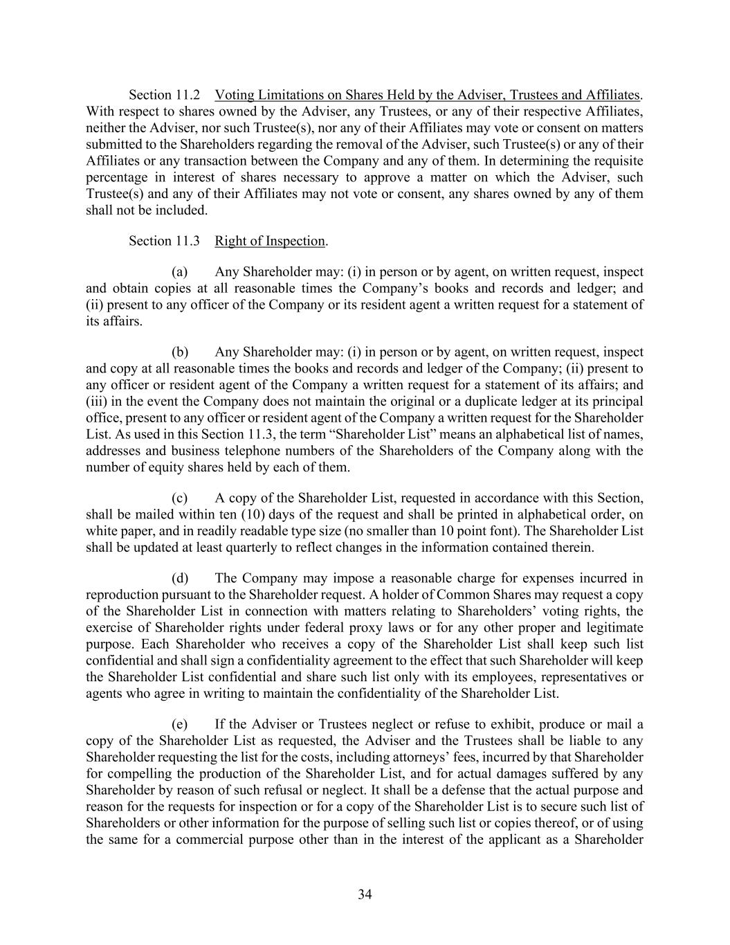 34 Section 11.2 Voting Limitations on Shares Held by the Adviser, Trustees and Affiliates. With respect to shares owned by the Adviser, any Trustees, or any of their respective Affiliates, neither the Adviser, nor such Trustee(s), nor any of their Affiliates may vote or consent on matters submitted to the Shareholders regarding the removal of the Adviser, such Trustee(s) or any of their Affiliates or any transaction between the Company and any of them. In determining the requisite percentage in interest of shares necessary to approve a matter on which the Adviser, such Trustee(s) and any of their Affiliates may not vote or consent, any shares owned by any of them shall not be included. Section 11.3 Right of Inspection. (a) Any Shareholder may: (i) in person or by agent, on written request, inspect and obtain copies at all reasonable times the Company’s books and records and ledger; and (ii) present to any officer of the Company or its resident agent a written request for a statement of its affairs. (b) Any Shareholder may: (i) in person or by agent, on written request, inspect and copy at all reasonable times the books and records and ledger of the Company; (ii) present to any officer or resident agent of the Company a written request for a statement of its affairs; and (iii) in the event the Company does not maintain the original or a duplicate ledger at its principal office, present to any officer or resident agent of the Company a written request for the Shareholder List. As used in this Section 11.3, the term “Shareholder List” means an alphabetical list of names, addresses and business telephone numbers of the Shareholders of the Company along with the number of equity shares held by each of them. (c) A copy of the Shareholder List, requested in accordance with this Section, shall be mailed within ten (10) days of the request and shall be printed in alphabetical order, on white paper, and in readily readable type size (no smaller than 10 point font). The Shareholder List shall be updated at least quarterly to reflect changes in the information contained therein. (d) The Company may impose a reasonable charge for expenses incurred in reproduction pursuant to the Shareholder request. A holder of Common Shares may request a copy of the Shareholder List in connection with matters relating to Shareholders’ voting rights, the exercise of Shareholder rights under federal proxy laws or for any other proper and legitimate purpose. Each Shareholder who receives a copy of the Shareholder List shall keep such list confidential and shall sign a confidentiality agreement to the effect that such Shareholder will keep the Shareholder List confidential and share such list only with its employees, representatives or agents who agree in writing to maintain the confidentiality of the Shareholder List. (e) If the Adviser or Trustees neglect or refuse to exhibit, produce or mail a copy of the Shareholder List as requested, the Adviser and the Trustees shall be liable to any Shareholder requesting the list for the costs, including attorneys’ fees, incurred by that Shareholder for compelling the production of the Shareholder List, and for actual damages suffered by any Shareholder by reason of such refusal or neglect. It shall be a defense that the actual purpose and reason for the requests for inspection or for a copy of the Shareholder List is to secure such list of Shareholders or other information for the purpose of selling such list or copies thereof, or of using the same for a commercial purpose other than in the interest of the applicant as a Shareholder