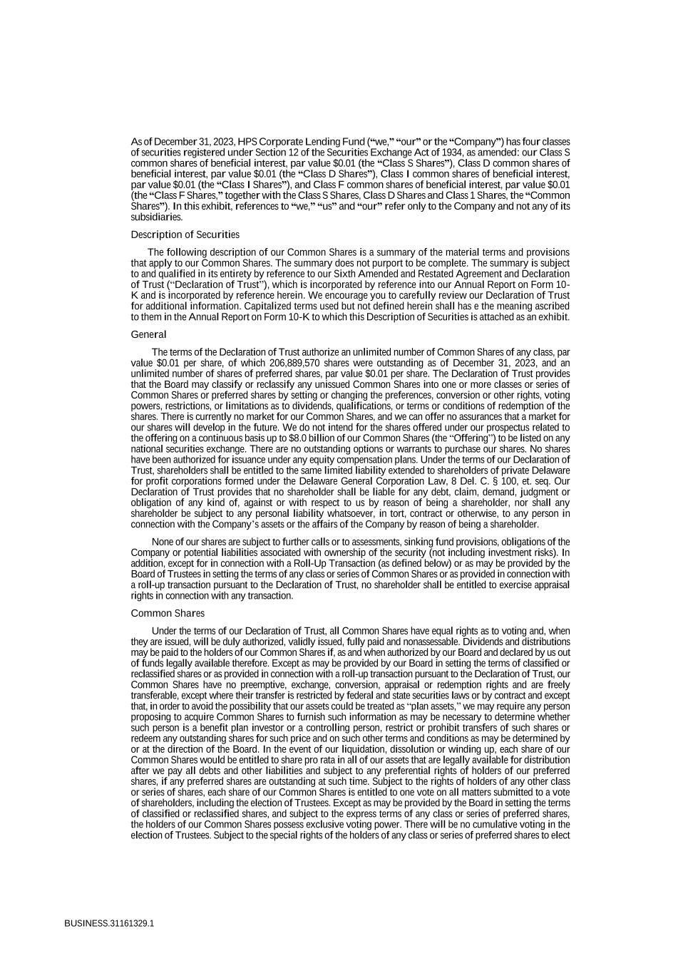 BUSINESS.31161329.1 As of December 31, 2023, HPS Corporate Lending Fund (“we,” “our” or the “Company”) has four classes of securities registered under Section 12 of the Securities Exchange Act of 1934, as amended: our Class S common shares of beneficial interest, par value $0.01 (the “Class S Shares”), Class D common shares of beneficial interest, par value $0.01 (the “Class D Shares”), Class I common shares of beneficial interest, par value $0.01 (the “Class I Shares”), and Class F common shares of beneficial interest, par value $0.01 (the “Class F Shares,” together with the Class S Shares, Class D Shares and Class 1 Shares, the “Common Shares”). In this exhibit, references to “we,” “us” and “our” refer only to the Company and not any of its subsidiaries. Description of Securities The following description of our Common Shares is a summary of the material terms and provisions that apply to our Common Shares. The summary does not purport to be complete. The summary is subject to and qualified in its entirety by reference to our Sixth Amended and Restated Agreement and Declaration of Trust (“Declaration of Trust”), which is incorporated by reference into our Annual Report on Form 10- K and is incorporated by reference herein. We encourage you to carefully review our Declaration of Trust for additional information. Capitalized terms used but not defined herein shall has e the meaning ascribed to them in the Annual Report on Form 10-K to which this Description of Securities is attached as an exhibit. General The terms of the Declaration of Trust authorize an unlimited number of Common Shares of any class, par value $0.01 per share, of which 206,889,570 shares were outstanding as of December 31, 2023, and an unlimited number of shares of preferred shares, par value $0.01 per share. The Declaration of Trust provides that the Board may classify or reclassify any unissued Common Shares into one or more classes or series of Common Shares or preferred shares by setting or changing the preferences, conversion or other rights, voting powers, restrictions, or limitations as to dividends, qualifications, or terms or conditions of redemption of the shares. There is currently no market for our Common Shares, and we can offer no assurances that a market for our shares will develop in the future. We do not intend for the shares offered under our prospectus related to the offering on a continuous basis up to $8.0 billion of our Common Shares (the “Offering”) to be listed on any national securities exchange. There are no outstanding options or warrants to purchase our shares. No shares have been authorized for issuance under any equity compensation plans. Under the terms of our Declaration of Trust, shareholders shall be entitled to the same limited liability extended to shareholders of private Delaware for profit corporations formed under the Delaware General Corporation Law, 8 Del. C. § 100, et. seq. Our Declaration of Trust provides that no shareholder shall be liable for any debt, claim, demand, judgment or obligation of any kind of, against or with respect to us by reason of being a shareholder, nor shall any shareholder be subject to any personal liability whatsoever, in tort, contract or otherwise, to any person in connection with the Company’s assets or the affairs of the Company by reason of being a shareholder. None of our shares are subject to further calls or to assessments, sinking fund provisions, obligations of the Company or potential liabilities associated with ownership of the security (not including investment risks). In addition, except for in connection with a Roll-Up Transaction (as defined below) or as may be provided by the Board of Trustees in setting the terms of any class or series of Common Shares or as provided in connection with a roll-up transaction pursuant to the Declaration of Trust, no shareholder shall be entitled to exercise appraisal rights in connection with any transaction. Common Shares Under the terms of our Declaration of Trust, all Common Shares have equal rights as to voting and, when they are issued, will be duly authorized, validly issued, fully paid and nonassessable. Dividends and distributions may be paid to the holders of our Common Shares if, as and when authorized by our Board and declared by us out of funds legally available therefore. Except as may be provided by our Board in setting the terms of classified or reclassified shares or as provided in connection with a roll-up transaction pursuant to the Declaration of Trust, our Common Shares have no preemptive, exchange, conversion, appraisal or redemption rights and are freely transferable, except where their transfer is restricted by federal and state securities laws or by contract and except that, in order to avoid the possibility that our assets could be treated as “plan assets,” we may require any person proposing to acquire Common Shares to furnish such information as may be necessary to determine whether such person is a benefit plan investor or a controlling person, restrict or prohibit transfers of such shares or redeem any outstanding shares for such price and on such other terms and conditions as may be determined by or at the direction of the Board. In the event of our liquidation, dissolution or winding up, each share of our Common Shares would be entitled to share pro rata in all of our assets that are legally available for distribution after we pay all debts and other liabilities and subject to any preferential rights of holders of our preferred shares, if any preferred shares are outstanding at such time. Subject to the rights of holders of any other class or series of shares, each share of our Common Shares is entitled to one vote on all matters submitted to a vote of shareholders, including the election of Trustees. Except as may be provided by the Board in setting the terms of classified or reclassified shares, and subject to t