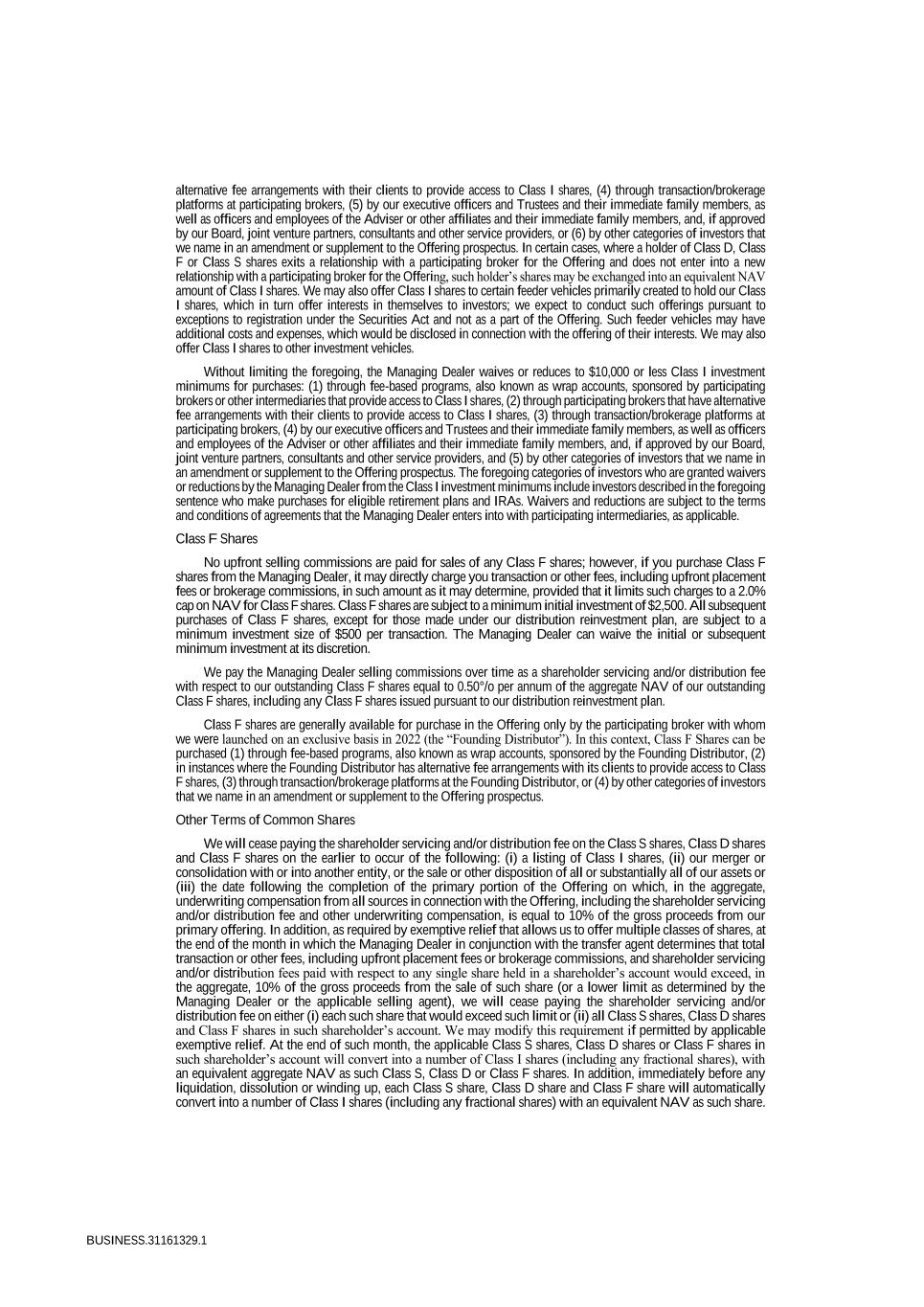 BUSINESS.31161329.1 alternative fee arrangements with their clients to provide access to Class I shares, (4) through transaction/brokerage platforms at participating brokers, (5) by our executive officers and Trustees and their immediate family members, as well as officers and employees of the Adviser or other affiliates and their immediate family members, and, if approved by our Board, joint venture partners, consultants and other service providers, or (6) by other categories of investors that we name in an amendment or supplement to the Offering prospectus. In certain cases, where a holder of Class D, Class F or Class S shares exits a relationship with a participating broker for the Offering and does not enter into a new relationship with a participating broker for the Offering, such holder’s shares may be exchanged into an equivalent NAV amount of Class I shares. We may also offer Class I shares to certain feeder vehicles primarily created to hold our Class I shares, which in turn offer interests in themselves to investors; we expect to conduct such offerings pursuant to exceptions to registration under the Securities Act and not as a part of the Offering. Such feeder vehicles may have additional costs and expenses, which would be disclosed in connection with the offering of their interests. We may also offer Class I shares to other investment vehicles. Without limiting the foregoing, the Managing Dealer waives or reduces to $10,000 or less Class I investment minimums for purchases: (1) through fee-based programs, also known as wrap accounts, sponsored by participating brokers or other intermediaries that provide access to Class I shares, (2) through participating brokers that have alternative fee arrangements with their clients to provide access to Class I shares, (3) through transaction/brokerage platforms at participating brokers, (4) by our executive officers and Trustees and their immediate family members, as well as officers and employees of the Adviser or other affiliates and their immediate family members, and, if approved by our Board, joint venture partners, consultants and other service providers, and (5) by other categories of investors that we name in an amendment or supplement to the Offering prospectus. The foregoing categories of investors who are granted waivers or reductions by the Managing Dealer from the Class I investment minimums include investors described in the foregoing sentence who make purchases for eligible retirement plans and IRAs. Waivers and reductions are subject to the terms and conditions of agreements that the Managing Dealer enters into with participating intermediaries, as applicable. Class F Shares No upfront selling commissions are paid for sales of any Class F shares; however, if you purchase Class F shares from the Managing Dealer, it may directly charge you transaction or other fees, including upfront placement fees or brokerage commissions, in such amount as it may determine, provided that it limits such charges to a 2.0% cap on NAV for Class F shares. Class F shares are subject to a minimum initial investment of $2,500. All subsequent purchases of Class F shares, except for those made under our distribution reinvestment plan, are subject to a minimum investment size of $500 per transaction. The Managing Dealer can waive the initial or subsequent minimum investment at its discretion. We pay the Managing Dealer selling commissions over time as a shareholder servicing and/or distribution fee with respect to our outstanding Class F shares equal to 0.50°/o per annum of the aggregate NAV of our outstanding Class F shares, including any Class F shares issued pursuant to our distribution reinvestment plan. Class F shares are generally available for purchase in the Offering only by the participating broker with whom we were launched on an exclusive basis in 2022 (the “Founding Distributor”). In this context, Class F Shares can be purchased (1) through fee-based programs, also known as wrap accounts, sponsored by the Founding Distributor, (2) in instances where the Founding Distributor has alternative fee arrangements with its clients to provide access to Class F shares, (3) through transaction/brokerage platforms at the Founding Distributor, or (4) by other categories of investors that we name in an amendment or supplement to the Offering prospectus. Other Terms of Common Shares We will cease paying the shareholder servicing and/or distribution fee on the Class S shares, Class D shares and Class F shares on the earlier to occur of the following: (i) a listing of Class I shares, (ii) our merger or consolidation with or into another entity, or the sale or other disposition of all or substantially all of our assets or (iii) the date following the completion of the primary portion of the Offering on which, in the aggregate, underwriting compensation from all sources in connection with the Offering, including the shareholder servicing and/or distribution fee and other underwriting compensation, is equal to 10% of the gross proceeds from our primary offering. In addition, as required by exemptive relief that allows us to offer multiple classes of shares, at the end of the month in which the Managing Dealer in conjunction with the transfer agent determines that total transaction or other fees, including upfront placement fees or brokerage commissions, and shareholder servicing and/or distribution fees paid with respect to any single share held in a shareholder’s account would exceed, in the aggregate, 10% of the gross proceeds from the sale of such share (or a lower limit as determined by the Managing Dealer or the applicable selling agent), we will cease paying the shareholder servicing and/or distribution fee on either (i) each such share that would exceed such limit or (ii) all Class S shares, Class D shares and Class F shares in such shareholder’s account. We may modify this requirement if permitted by applicable exemptive relief. At the en