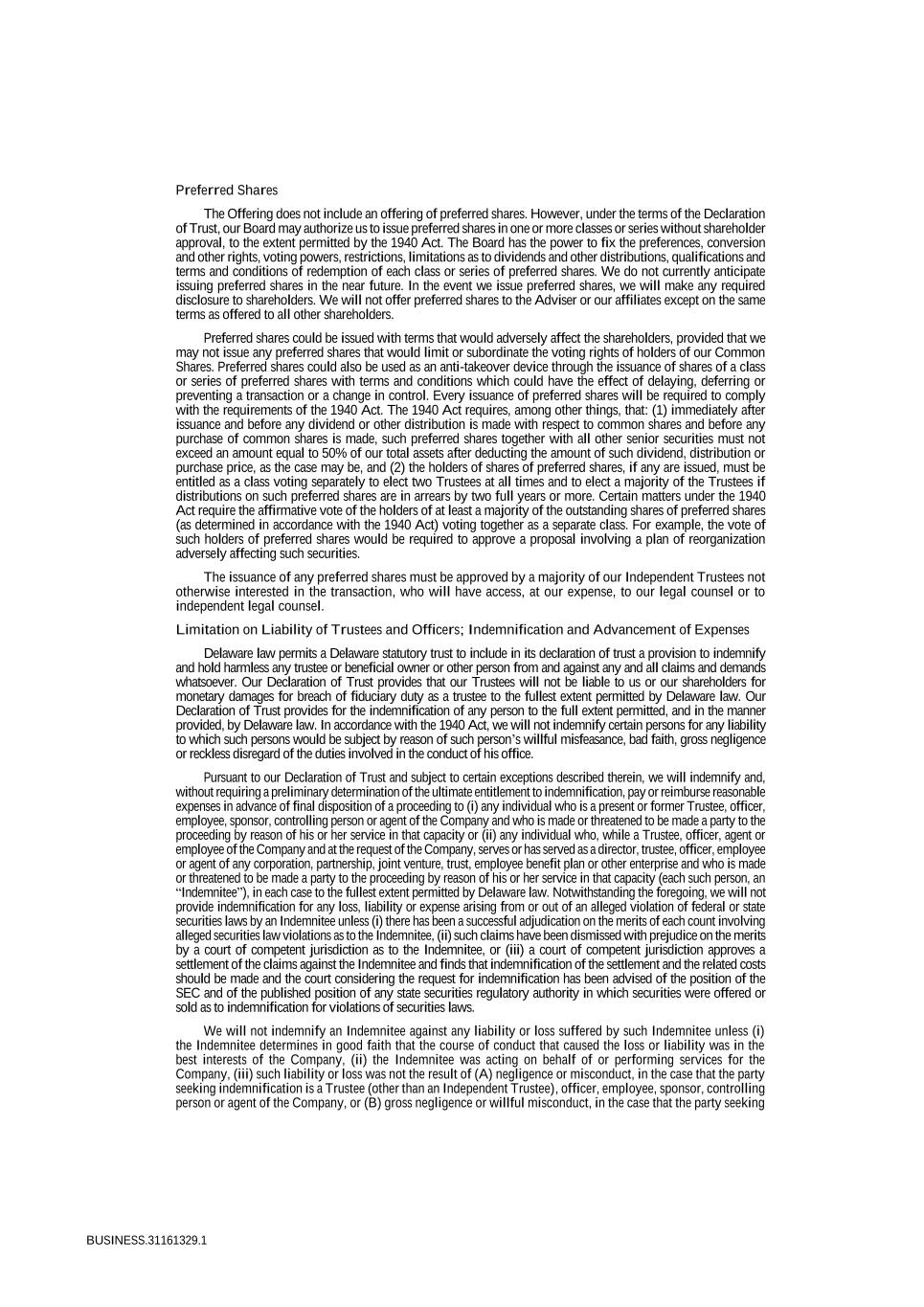 BUSINESS.31161329.1 Preferred Shares The Offering does not include an offering of preferred shares. However, under the terms of the Declaration of Trust, our Board may authorize us to issue preferred shares in one or more classes or series without shareholder approval, to the extent permitted by the 1940 Act. The Board has the power to fix the preferences, conversion and other rights, voting powers, restrictions, limitations as to dividends and other distributions, qualifications and terms and conditions of redemption of each class or series of preferred shares. We do not currently anticipate issuing preferred shares in the near future. In the event we issue preferred shares, we will make any required disclosure to shareholders. We will not offer preferred shares to the Adviser or our affiliates except on the same terms as offered to all other shareholders. Preferred shares could be issued with terms that would adversely affect the shareholders, provided that we may not issue any preferred shares that would limit or subordinate the voting rights of holders of our Common Shares. Preferred shares could also be used as an anti-takeover device through the issuance of shares of a class or series of preferred shares with terms and conditions which could have the effect of delaying, deferring or preventing a transaction or a change in control. Every issuance of preferred shares will be required to comply with the requirements of the 1940 Act. The 1940 Act requires, among other things, that: (1) immediately after issuance and before any dividend or other distribution is made with respect to common shares and before any purchase of common shares is made, such preferred shares together with all other senior securities must not exceed an amount equal to 50% of our total assets after deducting the amount of such dividend, distribution or purchase price, as the case may be, and (2) the holders of shares of preferred shares, if any are issued, must be entitled as a class voting separately to elect two Trustees at all times and to elect a majority of the Trustees if distributions on such preferred shares are in arrears by two full years or more. Certain matters under the 1940 Act require the affirmative vote of the holders of at least a majority of the outstanding shares of preferred shares (as determined in accordance with the 1940 Act) voting together as a separate class. For example, the vote of such holders of preferred shares would be required to approve a proposal involving a plan of reorganization adversely affecting such securities. The issuance of any preferred shares must be approved by a majority of our Independent Trustees not otherwise interested in the transaction, who will have access, at our expense, to our legal counsel or to independent legal counsel. Limitation on Liability of Trustees and Officers; Indemnification and Advancement of Expenses Delaware law permits a Delaware statutory trust to include in its declaration of trust a provision to indemnify and hold harmless any trustee or beneficial owner or other person from and against any and all claims and demands whatsoever. Our Declaration of Trust provides that our Trustees will not be liable to us or our shareholders for monetary damages for breach of fiduciary duty as a trustee to the fullest extent permitted by Delaware law. Our Declaration of Trust provides for the indemnification of any person to the full extent permitted, and in the manner provided, by Delaware law. In accordance with the 1940 Act, we will not indemnify certain persons for any liability to which such persons would be subject by reason of such person’s willful misfeasance, bad faith, gross negligence or reckless disregard of the duties involved in the conduct of his office. Pursuant to our Declaration of Trust and subject to certain exceptions described therein, we will indemnify and, without requiring a preliminary determination of the ultimate entitlement to indemnification, pay or reimburse reasonable expenses in advance of final disposition of a proceeding to (i) any individual who is a present or former Trustee, officer, employee, sponsor, controlling person or agent of the Company and who is made or threatened to be made a party to the proceeding by reason of his or her service in that capacity or (ii) any individual who, while a Trustee, officer, agent or employee of the Company and at the request of the Company, serves or has served as a director, trustee, officer, employee or agent of any corporation, partnership, joint venture, trust, employee benefit plan or other enterprise and who is made or threatened to be made a party to the proceeding by reason of his or her service in that capacity (each such person, an “Indemnitee”), in each case to the fullest extent permitted by Delaware law. Notwithstanding the foregoing, we will not provide indemnification for any loss, liability or expense arising from or out of an alleged violation of federal or state securities laws by an Indemnitee unless (i) there has been a successful adjudication on the merits of each count involving alleged securities law violations as to the Indemnitee, (ii) such claims have been dismissed with prejudice on the merits by a court of competent jurisdiction as to the Indemnitee, or (iii) a court of competent jurisdiction approves a settlement of the claims against the Indemnitee and finds that indemnification of the settlement and the related costs should be made and the court considering the request for indemnification has been advised of the position of the SEC and of the published position of any state securities regulatory authority in which securities were offered or sold as to indemnification for violations of securities laws. We will not indemnify an Indemnitee against any liability or loss suffered by such Indemnitee unless (i) the Indemnitee determines in good faith that the course of conduct that caused the loss or liability was in the best interests of the Company