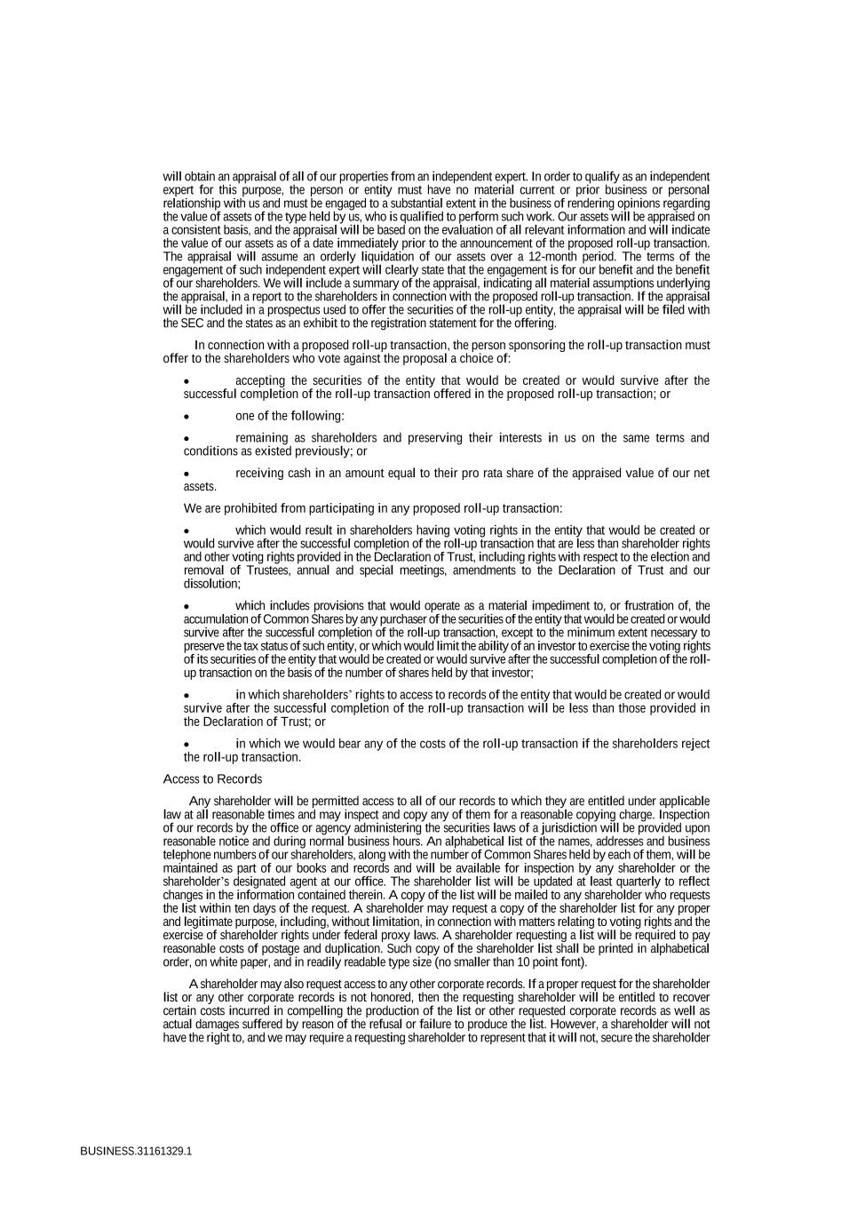 BUSINESS.31161329.1 will obtain an appraisal of all of our properties from an independent expert. In order to qualify as an independent expert for this purpose, the person or entity must have no material current or prior business or personal relationship with us and must be engaged to a substantial extent in the business of rendering opinions regarding the value of assets of the type held by us, who is qualified to perform such work. Our assets will be appraised on a consistent basis, and the appraisal will be based on the evaluation of all relevant information and will indicate the value of our assets as of a date immediately prior to the announcement of the proposed roll-up transaction. The appraisal will assume an orderly liquidation of our assets over a 12-month period. The terms of the engagement of such independent expert will clearly state that the engagement is for our benefit and the benefit of our shareholders. We will include a summary of the appraisal, indicating all material assumptions underlying the appraisal, in a report to the shareholders in connection with the proposed roll-up transaction. If the appraisal will be included in a prospectus used to offer the securities of the roll-up entity, the appraisal will be filed with the SEC and the states as an exhibit to the registration statement for the offering. In connection with a proposed roll-up transaction, the person sponsoring the roll-up transaction must offer to the shareholders who vote against the proposal a choice of: • accepting the securities of the entity that would be created or would survive after the successful completion of the roll-up transaction offered in the proposed roll-up transaction; or • one of the following: • remaining as shareholders and preserving their interests in us on the same terms and conditions as existed previously; or • receiving cash in an amount equal to their pro rata share of the appraised value of our net assets. We are prohibited from participating in any proposed roll-up transaction: • which would result in shareholders having voting rights in the entity that would be created or would survive after the successful completion of the roll-up transaction that are less than shareholder rights and other voting rights provided in the Declaration of Trust, including rights with respect to the election and removal of Trustees, annual and special meetings, amendments to the Declaration of Trust and our dissolution; • which includes provisions that would operate as a material impediment to, or frustration of, the accumulation of Common Shares by any purchaser of the securities of the entity that would be created or would survive after the successful completion of the roll-up transaction, except to the minimum extent necessary to preserve the tax status of such entity, or which would limit the ability of an investor to exercise the voting rights of its securities of the entity that would be created or would survive after the successful completion of the roll- up transaction on the basis of the number of shares held by that investor; • in which shareholders’ rights to access to records of the entity that would be created or would survive after the successful completion of the roll-up transaction will be less than those provided in the Declaration of Trust; or • in which we would bear any of the costs of the roll-up transaction if the shareholders reject the roll-up transaction. Access to Records Any shareholder will be permitted access to all of our records to which they are entitled under applicable law at all reasonable times and may inspect and copy any of them for a reasonable copying charge. Inspection of our records by the office or agency administering the securities laws of a jurisdiction will be provided upon reasonable notice and during normal business hours. An alphabetical list of the names, addresses and business telephone numbers of our shareholders, along with the number of Common Shares held by each of them, will be maintained as part of our books and records and will be available for inspection by any shareholder or the shareholder’s designated agent at our office. The shareholder list will be updated at least quarterly to reflect changes in the information contained therein. A copy of the list will be mailed to any shareholder who requests the list within ten days of the request. A shareholder may request a copy of the shareholder list for any proper and legitimate purpose, including, without limitation, in connection with matters relating to voting rights and the exercise of shareholder rights under federal proxy laws. A shareholder requesting a list will be required to pay reasonable costs of postage and duplication. Such copy of the shareholder list shall be printed in alphabetical order, on white paper, and in readily readable type size (no smaller than 10 point font). A shareholder may also request access to any other corporate records. If a proper request for the shareholder list or any other corporate records is not honored, then the requesting shareholder will be entitled to recover certain costs incurred in compelling the production of the list or other requested corporate records as well as actual damages suffered by reason of the refusal or failure to produce the list. However, a shareholder will not have the right to, and we may require a requesting shareholder to represent that it will not, secure the shareholder