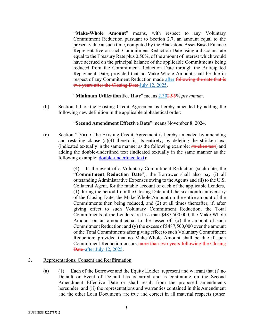 3 BUSINESS.32227373.2 “Make-Whole Amount” means, with respect to any Voluntary Commitment Reduction pursuant to Section 2.7, an amount equal to the present value at such time, computed by the Blackstone Asset Based Finance Representative on such Commitment Reduction Date using a discount rate equal to the Treasury Rate plus 0.50%, of the amount of interest which would have accrued on the principal balance of the applicable Commitments being reduced from the Commitment Reduction Date through the Anticipated Repayment Date; provided that no Make-Whole Amount shall be due in respect of any Commitment Reduction made after following the date that is two years after the Closing Date July 12, 2025. “Minimum Utilization Fee Rate” means 2.302.95% per annum. (b) Section 1.1 of the Existing Credit Agreement is hereby amended by adding the following new definition in the applicable alphabetical order: “Second Amendment Effective Date” means November 8, 2024. (c) Section 2.7(a) of the Existing Credit Agreement is hereby amended by amending and restating clause (a)(4) thereto in its entirety, by deleting the stricken text (indicated textually in the same manner as the following example: stricken text) and adding the double-underlined text (indicated textually in the same manner as the following example: double-underlined text): (4) In the event of a Voluntary Commitment Reduction (such date, the “Commitment Reduction Date”), the Borrower shall also pay (i) all outstanding Administrative Expenses owing to the Agents and (ii) to the U.S. Collateral Agent, for the ratable account of each of the applicable Lenders, (1) during the period from the Closing Date until the six-month anniversary of the Closing Date, the Make-Whole Amount on the entire amount of the Commitments then being reduced, and (2) at all times thereafter, if, after giving effect to such Voluntary Commitment Reduction, the Total Commitments of the Lenders are less than $487,500,000, the Make-Whole Amount on an amount equal to the lesser of: (x) the amount of such Commitment Reduction; and (y) the excess of $487,500,000 over the amount of the Total Commitments after giving effect to such Voluntary Commitment Reduction; provided that no Make-Whole Amount shall be due if such Commitment Reduction occurs more than two years following the Closing Date after July 12, 2025. 3. Representations, Consent and Reaffirmation. (a) (1) Each of the Borrower and the Equity Holder represent and warrant that (i) no Default or Event of Default has occurred and is continuing on the Second Amendment Effective Date or shall result from the proposed amendments hereunder, and (ii) the representations and warranties contained in this Amendment and the other Loan Documents are true and correct in all material respects (other