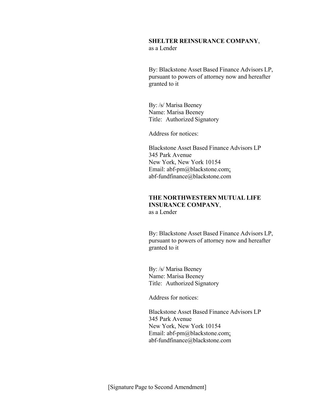 [Signature Page to Second Amendment] SHELTER REINSURANCE COMPANY, as a Lender By: Blackstone Asset Based Finance Advisors LP, pursuant to powers of attorney now and hereafter granted to it By: /s/ Marisa Beeney Name: Marisa Beeney Title: Authorized Signatory Address for notices: Blackstone Asset Based Finance Advisors LP 345 Park Avenue New York, New York 10154 Email: abf-pm@blackstone.com; abf-fundfinance@blackstone.com THE NORTHWESTERN MUTUAL LIFE INSURANCE COMPANY, as a Lender By: Blackstone Asset Based Finance Advisors LP, pursuant to powers of attorney now and hereafter granted to it By: /s/ Marisa Beeney Name: Marisa Beeney Title: Authorized Signatory Address for notices: Blackstone Asset Based Finance Advisors LP 345 Park Avenue New York, New York 10154 Email: abf-pm@blackstone.com; abf-fundfinance@blackstone.com